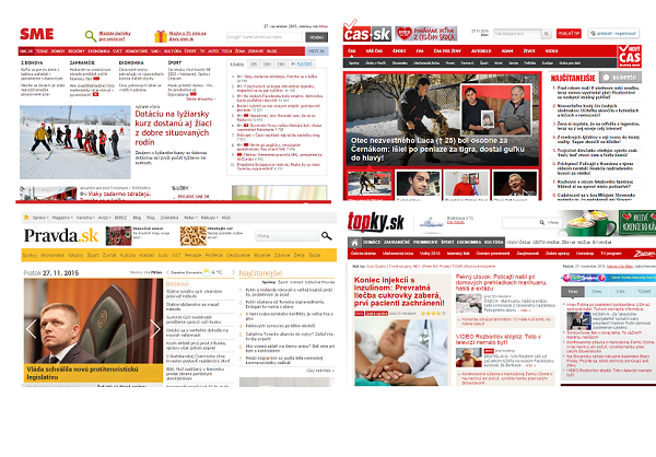 Ringier Axel Springer Slovakia/Azet: cas.sk, aktuality.sk, zive.sk Zoznam: topky.sk News and Media Holding: aktualne.sk, pluska.sk, etrend.sk Petit Press: sme.sk, ujszo.com Perex: pravda.sk Mac TV: noviny.sk Markíza - Slovakia: tvnoviny.sk Mafra Slovakia: hnonline.sk SITA: webnoviny.sk N Press: dennikn.sk TASR: teraz.sk |