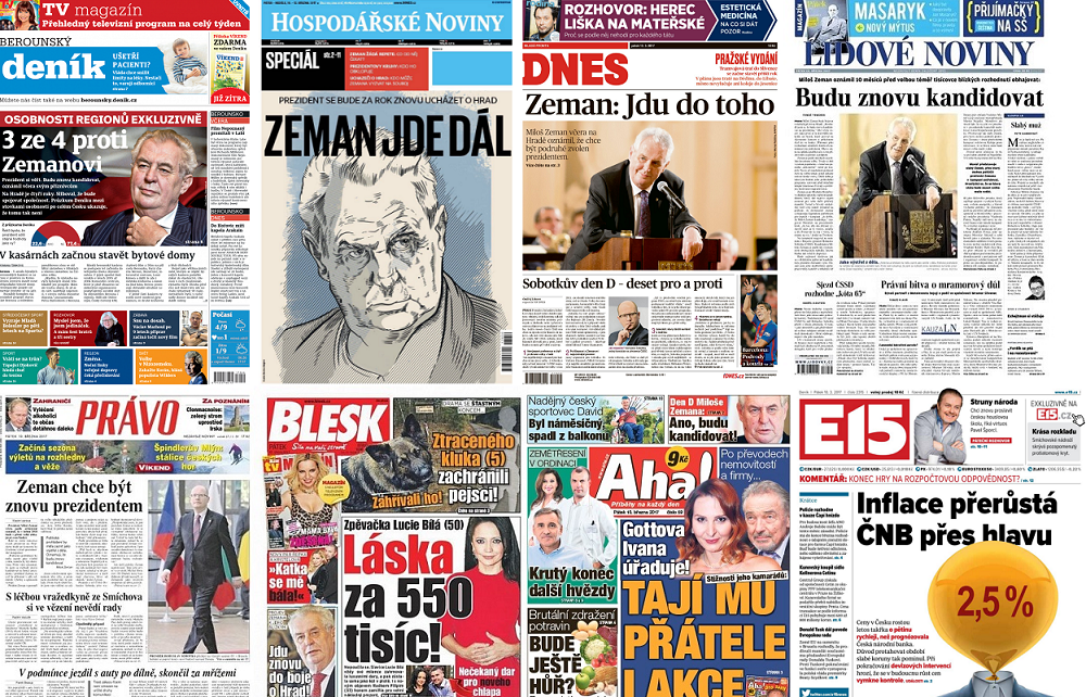 Všechny zpravodajské deníky přinášejí ve svém pátečním vydání na titulních stranách informaci o opětovné kandidatuře Miloše Zemana na prezidenta republiky. "Zeman jde dál", "Budu znovu kandidovat", "Zeman: Jdu do toho" či "Zeman chce být znovu prezidentem" hlásí titulky deníků Hospodářské noviny (které vycházejí i s 11stránkovým speciálem o Miloši Zemanovi), Lidové noviny, MF Dnes a Právo. Regionální Deník zvolil titulek "3 ze 4 proti Zemanovi" a přináší postoje osobností regionů.