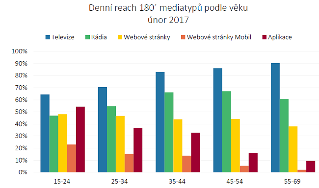 Středním věkovým generacím co do zásahu potom dominují TV a rádia. Čechů ve věku 35-44 let, kteří stráví s mobilními aplikacemi denně alespoň 3 minuty, je 33 %. Nejstarší generace jsou dle očekávání nejsilnějšími konzumenty především TV, i tak je ale každý desátý Čech ve věku 55-69 let denně oslovitelný prostřednictvím mobilních aplikací.