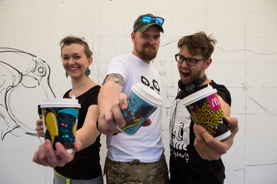 Na kelímky se dostaly návrhy Yeve Drovossekove, Karla Cettla a Dalibora Krcha. Své vytvory představili kreslíři minulý týden v živé show před restaurací McDonald's u pražského Edenu.