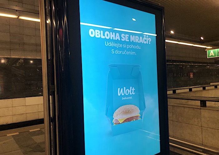 Původně finská služba na doručování jídla Wolt v srpnu zahájila reklamní kampaň, v níž se sdělení dynamicky mění podle aktuálního počasí. Nasazena je na 17 digitálních CLV ve stanicích pražského metra, které korespondují s rozvozovými oblastmi Woltu. K vidění jsou například na Andělu, I. P. Pavlova, Náměstí Republiky, Můstku, Muzeu, Chodově, Budějovické nebo Hlavním nádraží.