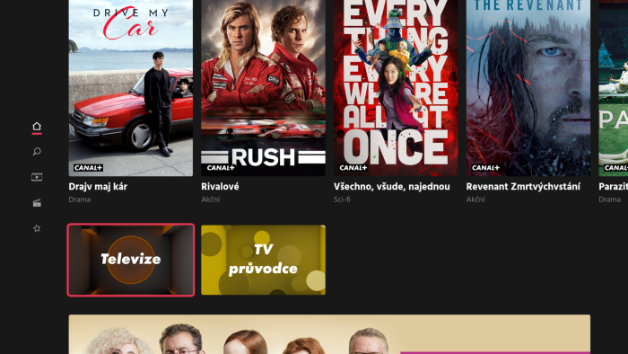 Jedním z rozdílů oproti videotéce Canal+ poskytované vlastním zákazníkům je kategorie čtyř dlaždic na hlavní stránce služby. Klienti Magenta TV mají k dispozici pouze sekce Televize a TV průvodce, naopak zde úplně chybí další dvě položky – Nyní v TV a TV archiv. Je to poměrně logické, protože zákazníci T-Mobilu nemají mezi televizními kanály k dispozici nejen Canal+ Sport 2, který bude vysílat tenisovou WTA, ale také stanice pod hlavičkou FilmBox.