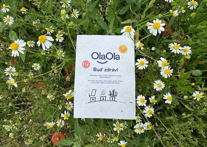 Značka doplňků stravy OlaOla, za níž stojí manželé Bernátkovi, se rozhodla upozornit na křehkost zdraví a trpělivost, kterou musí lidé vynaložit při cestě za dlouhověkostí. Ve spolupráci se studiem Green Cat ekologické marketérky Judity Nechvátalové připravila osobní přání z papíru, obsahující semínka heřmánku pravého. Papír je možné roztrhat, zasadit do zeminy a bylinku v domácím prostředí vypěstovat.