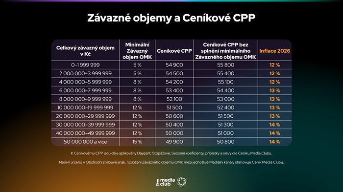 Mediální zastupitelství Media Club představilo v minulém týdnu rysy své obchodní politiky pro rok 2026. Průměrné navýšení cen reklamy v jednotlivých mediatypech obchodovaných společností Media Club ve srovnání s rokem 2025 je následující: