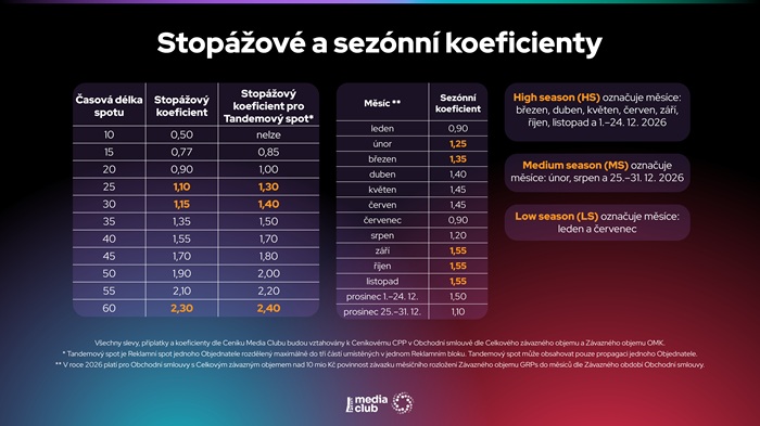 Media Club motivuje klienty k včasnému nákupu reklamy zvýhodněnými daypart koeficienty: při uzavření smlouvy do 1. prosince 2025 se koeficient pro off prime-time snižuje na 0,95 a pro prime-time na 1,05. Při podpisu do 12. ledna 2026 je pak off prime-time na úrovni 1 a prime-time na 1,05 (ceníkově off prime-time 1 a prime-time 1,1).