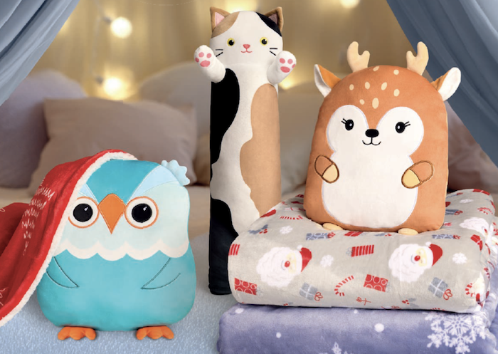 V nabídce bude pět dlouhých plyšáků (tučňák, kočka, medvěd, liška a jednorožec), které mají na výšku přes 60 cm, a pět širokých plyšáků (opice, sova, koala, myš a srnka) s rozměrem 32 x 40 cm. Nabízené produkty lze pořídit za zvýhodněnou cenu 149,90 Kč, nebo za plnou cenu 399,90 Kč.