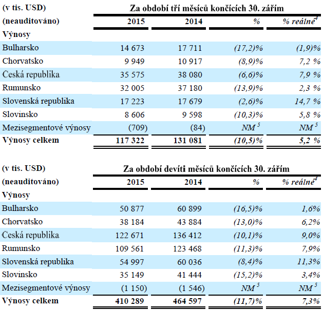 celkově při konstantním směnném kurzu za tři čtvrtletí 2015 meziročně zvýšily o 5 % na 117,3 mil. USD.
