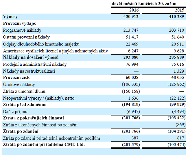 Výnosy společnosti CME celkem se meziročně ve třetím čtvrtletí zvýšily o 8 % na 126,7 mil. USD a za prvních devět měsíců o 5 % na 430,9 mil. USD. Provozní zisk před odpisy a amortizací OIBDA se více než zdvojnásobil na 18 mil. USD (450 mil. Kč) z 8,4 mil.USD před rokem. Čistá ztráta firmy ve třetím čtvrtletí ale představovala -19,63 mil. USD a za prvních devět měsíců -201,4 mil. USD (cca -4,8 mld. Kč), což je téměř dvojnásobek oproti stejnému období roku 2015.