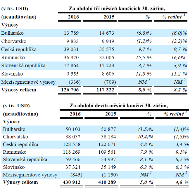 Podle analýzy J&T banky je pozitivní především obnovený růst tržeb a ziskovosti v ČR, kde byla první polovina roku nepřesvědčivá. "Dosavadní výhled managementu počítá s celoročním výsledkem asi 139,7 až 147 milionů dolarů, přičemž čtvrtý kvartál je sezónně nejsilnější. Jsme názoru, že překonání odhadů za třetí čtvrtletí a slušná dynamika tržeb v ČR a Rumunsku povedou k překonání celoročního cíle. Náš současný odhad je 151,8 milionu dolarů," dodal pro ČTK Pavel Ryska z J&T.