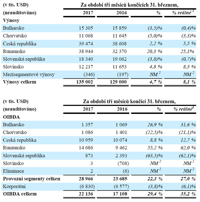 Výnosy a OIBDA v jednotlivých zemích CME, 1Q/2017
