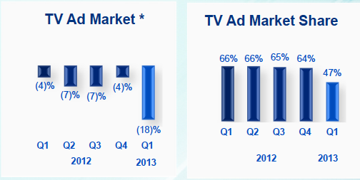 Celkově pak CME odhaduje, že český televizní trh poklesl v prvním čtvrtletí o 18 % (v loňském prvním čtvrtletí pokles o 4 %). Podíl Nova Group na reklamním televizním trhu se pak měl v prvním čtvrtletí 2013 snížit na 47 % z loňských 66 %.