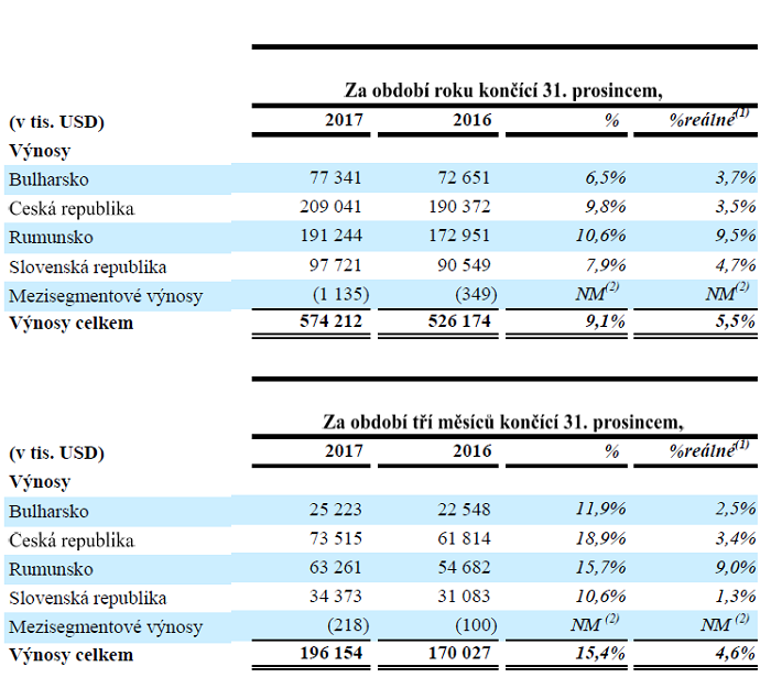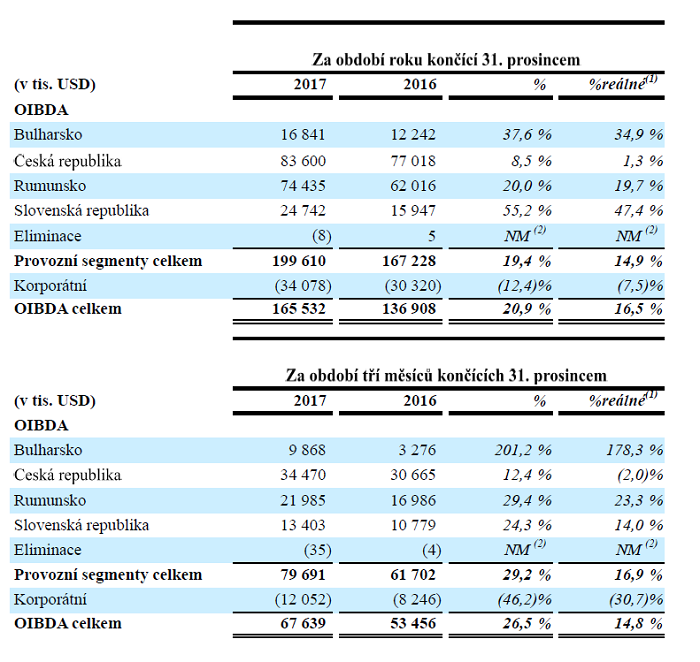Provozní zisk před odpisy a amortizací OIBDA vzrostl loni v Česku za celý rok o jedno procento na 83,4 mil. USD (cca 1,9 mld. Kč). Za období čtvrtého čtvrtletí se meziročně snížil o dvě procenta. Výsledek znovu ovlivnila změna kurzu dolaru mezi lety 2016 a 2017. Český trh zůstává z pohledu OIBDA nejsilnějším před trhem rumunským.