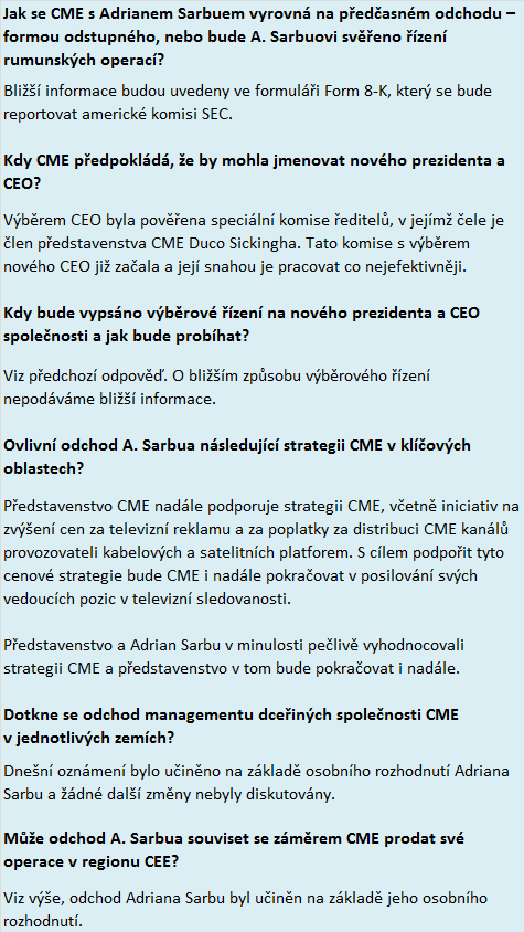 Překvapivé oznámení o odchodu Adriana Sarbua z funkce generálního ředitele a prezidenta CME je podle informací CME jeho osobním rozhodnutím. „Dnešní oznámení bylo učiněno na základě osobního rozhodnutí Adriana Sarbu a žádné další změny nebyly diskutovány,“ uvedlo oddělení CME pro vztahy s investory na dotaz MediaGuru.cz, zda se jeho odchod dotkne managementu dceřiných společností CME v jednotlivých zemích. CME působí kromě Česka na Slovensku, v Bulharsku, Rumunsku, Chorvatsku a Slovinsku.