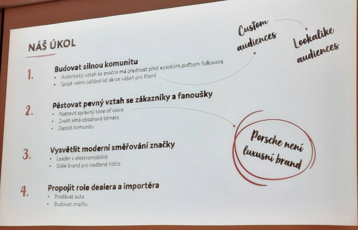Ondřej Tyleček, Business Director a spolumajitel agentury Fairy Tailors, ukázal, jak postavit obsahovou strategii, která odráží hodnoty značky, baví zákazníky a prodává auta. Agentura už více než tři roky vytváří obsah na Instagram a Facebook pro českou pobočku Porsche. Cílem komunikace je vytvořit komunitu a spojit lidi kolem této značky, kteří obvykle nemají stejné zájmy a nic je nespojuje kromě toho, že si koupili Porsche.