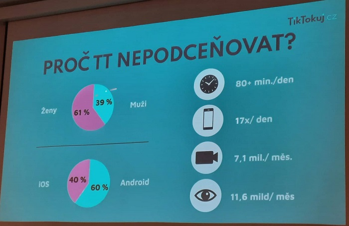 Důvodů, proč TikTok nepodceňovat, uvedl Duc více. Jednak průměrný uživatel v Česku na něm tráví 80 minut denně, sleduje ho 61 % žen, 39 % mužů. V Česku se pak zde objeví přes 7 mil videí za měsíc. Nejoblíbenější jsou tříminutová videa a maximální délka je deset minut. Za tři vteřiny je třeba nejen zaujmout uživatele, ale i udržet jeho pozornost a vyzvat k akci. „Na začátku je ale nejdůležitější, aby vás začali lidé vůbec sledovat, protože když ostatní vidí, že vás někdo sleduje, jdou k vám,“ dodal David Duc.