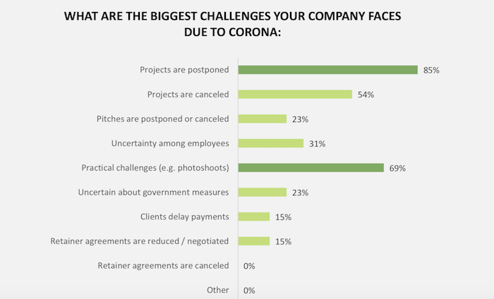 Za největší výzvy v tuto chvíli agentury a značky vnímají: odklad projektů a s tím spojený zásah do cash flow a provozu (85 %), problémy s tvorbou obsahu, například při realizaci focení, natočení apod. (69 %), zrušené projekty (54 %), nejistota zaměstnanců (31 %), zrušené tendry (23 %), opožděné úhrady od klientů (15 %) a snižování ročních záloh (15 %).