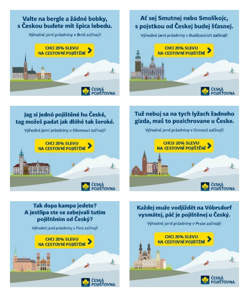 „Pro každý region jsme připravili vizuály na míru. Kromě vyobrazení památek, které jsou pro konkrétní město typické, využíváme také specifické nářečí dané oblasti,“ vysvětluje Pavel Mužík z Útvaru řízení internetového prodeje České pojišťovny.
