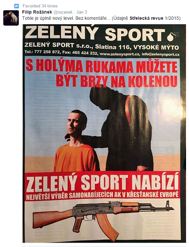 Reklama na útočné pušky v lednovém čísle časopisu Střelecká revue ukazuje záběr z popravy Davida Hainese, zveřejněné loni radikály z hnutí Islámský stát (IS). V inzerátu je snímek klečícího Brita v oranžovém a ozbrojence IS v černém. Fotku doplňuje nápis "S holýma rukama můžete být brzy na kolenou" a text informující čtenáře, že vysokomýtský obchod Zelený sport nabízí největší výběr kalašnikovů v "křesťanské Evropě".