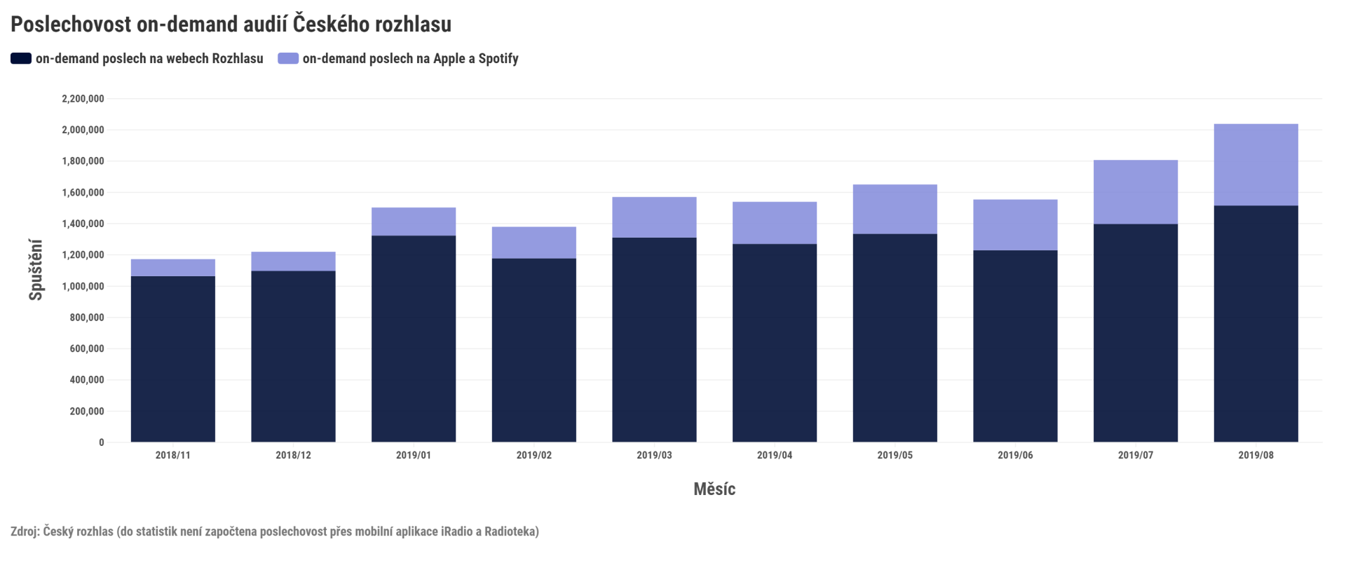 Český rozhlas registruje v letošním roce na internetu růst poslechu na vyžádání. V letošním srpnu dosáhl počet spuštění audio pořadů na vyžádání dva miliony a v průběhu necelého roku se tento počet zdvojnásobil. Zároveň roste poslechovost podcastů v prostředí třetích stran (Apple, YouTube atp.), kde se tato poslechovost zpětinásobila. K nejposlouchanějším podcastům patří Vinohradská 12, Host Lucie Výborné a Buchty.