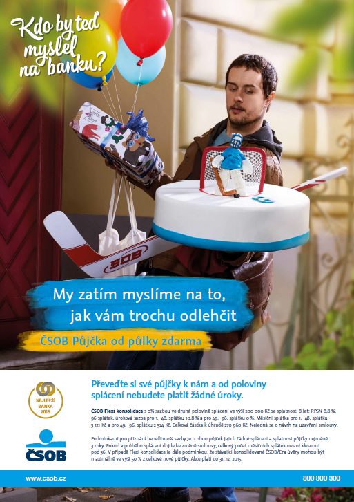 ČSOB spouští novou kampaň na podporu půjček, se zaměřením na konsolidaci externích půjček. V rámci nedávno představeného komunikačního konceptu „Kdo by teď myslel na banku“ nasadí nový televizní spot, dále reklamu na internetu, v outdooru i na pobočkách společnosti.