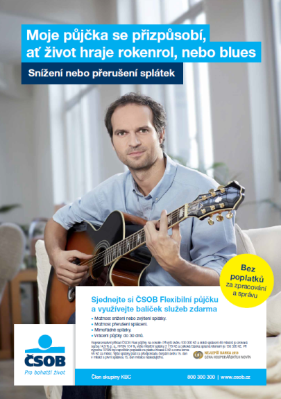 ČSOB odstartuje 1. listopadu kampaň na podporu prodeje nových Flexibilních půjček. Kampaň, která potrvá do poloviny prosince, poběží v televizi, tisku, outdooru a na internetu. Doplní ji komunikace na pobočkách. Jejím hlavním symbolem je kytara, kterou doprovází motto kampaně: „Moje půjčka se přizpůsobí, ať život hraje rokenrol, nebo blues.“