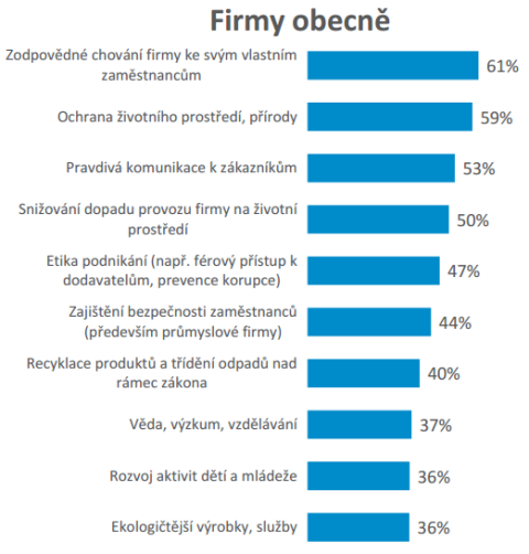 V oblasti CSR očekává česká veřejnost v prvé řadě zodpovědné chování firem k vlastním zaměstnancům a aktivity, které napomáhají ochraně životního prostředí, a také pravdivou komunikaci k zákazníkům. V té se firmy v posledních letech podle veřejnosti polepšily.