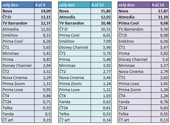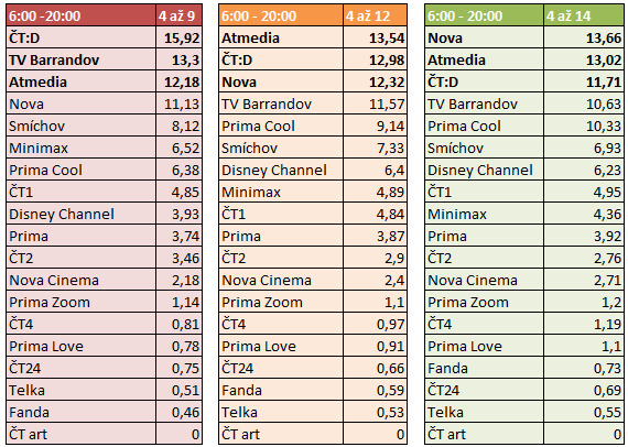 Česká televize označuje ČT:D za nejsledovanější kanál u dětí 4-12 let. To však platí pouze v případě, že se jeho sledovanost počítá v čase vysílání od 6:00 do 20:00. V takovém případě dosáhl ČT:D u dětí 4-12 let podílu ve výši 13 % (za období od 30.8. do 27.9. 2013), což je nejvíce z jednotlivých kanálů. Podíl stanic Atmedia je souhrnem většího počtu kanálů. U malých diváků ve věku 4-9 let je opět podíl ČT:D, počítaný v čase od 6:00 do 20:00, vyšší než u diváků do 12 let a nejvyšší ze všech sledovaných stanic.