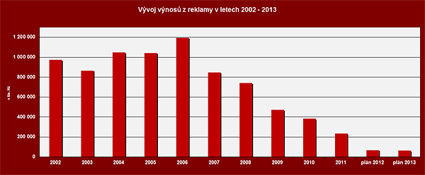 Po legislativním omezení v roce 2011, které ČT nedovoluje vysílat klasickou spotovou reklamu na kanálech ČT1 a ČT24, došlo k podstatnému snížení výnosů z reklamního vysílání České televize. V loňském roce měly výnosy dosáhnout 81 mil. Kč, pro letošní rok počítá plán s 60 mil. Kč. Prodej spotové reklamy je povolen pouze na kanálech ČT2 a ČT Sport, objem reklamy je ale limitován na 0,5 % denního vysílacího času.