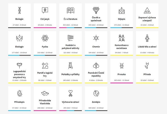 Videa pokrývají přes dvacítku předmětů od biologie po zeměpis, jsou členěna podle stupňů vzdělávání i konkrétních témat. Témat jsou zatím dvě stovky. Plánem je ale portál do budoucna rozšiřovat nejen o nová videa, nové předměty, ale i o pracovní listy.