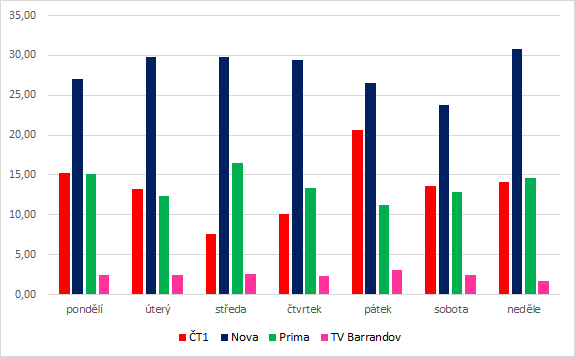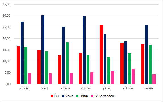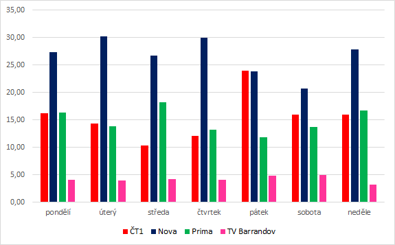 První pololetí letošního roku na televizním trhu ukázalo, že v hlavním vysílacím čase zůstává ČT1 nejsilnější v pátek večer, zatímco pro Novu jsou stále nejsilnější úterky a čtvrtky a pro Primu středa. TV Barrandov vykázala nejlepší výsledky v sobotním večeru. Vyplývá to z průměrných podílů vybraných televizních stanic v hlavním vysílacím čase (19:00-23:00) v jednotlivých dnech v týdnu za prvních šest měsíců letošního roku.