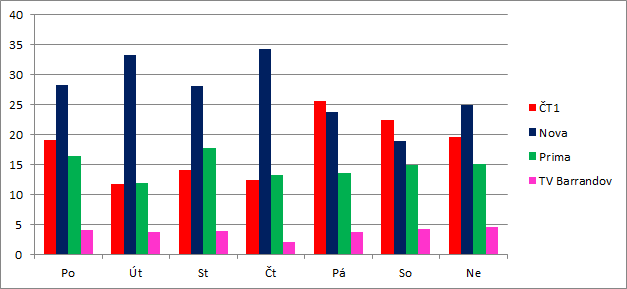 Hlavní kanál skupiny Barrandov si v letošním podzimním prime-time polepšil především v pondělí a v úterý (meziročně +0,4 pb., resp. 0,5 pb.), naopak nižších výsledků než loni dosahuje ve čtvrtek a v pátek.