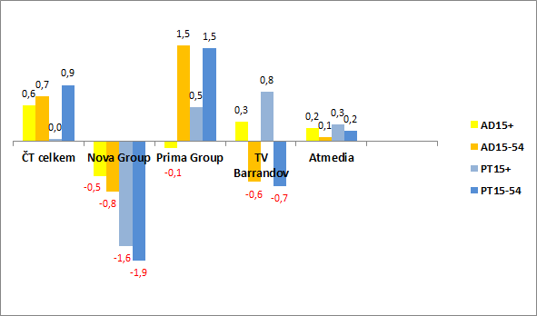 V širší skupině 15+ si v celodenním vysílání v meziročním srovnání pohoršily všechny hlavní kanály třech nejsilnějších televizních skupin (Nova, ČT1, Prima), nejvíce se snížil podíl vedoucí Novy. Prima si jako jediná z této trojice naopak polepšila v mladší skupině diváků 15-54.