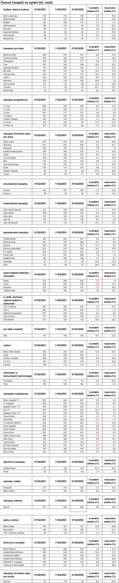 Počet čtenářů časopisů představoval ve druhém a třetím čtvrtletí 2021 celkem 6,8 mil. osob ve věku 12-79 let. Ukazují to data výzkumu čtenosti Media projektu za druhé a třetí čtvrtletí 2021. Je to srovnatelný výsledek jako ve stejném období o rok dříve. Čtenost časopisů na vydání zůstává na úrovni 58 % populace a meziročně se mírně zvýšila o jeden procentní bod, což představuje asi 55 tisíc čtenářů.
