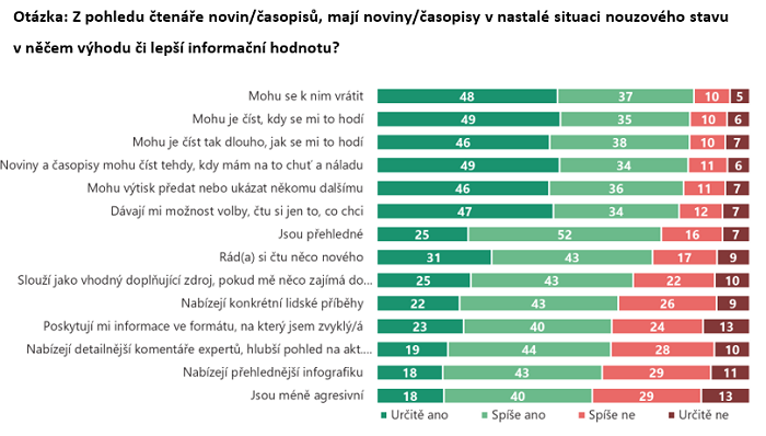 Z výzkumu rovněž vyplynulo, že v době omezení souvisejících s koronavirem četlo noviny a časopisy více 17 % dotázaných. Naopak 15 % lidí do průzkumu uvedlo, že tisk četli méně. Stejnou čtenost deklarovalo 53 % respondentů.