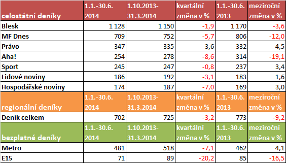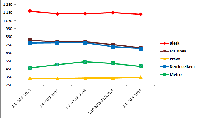 Přestože průměrná čtenost deníků klesá v korelaci s vývojem prodaného nákladu, mezi celostátními deníky je několik titulů, kterým se čtenost v meziročním srovnání podařilo navýšit. Týká se to deníků Právo, Sport, Hospodářské noviny a Lidové noviny. Z bezplatných deníků zvýšilo čtenost oproti prvnímu loňskému pololetí Metro. Právo je současně jediným deníkem, kterému čtenost mírně vzrostla i ve srovnání s prvním letošním čtvrtletím a posledním čtvrtletím roku 2013.