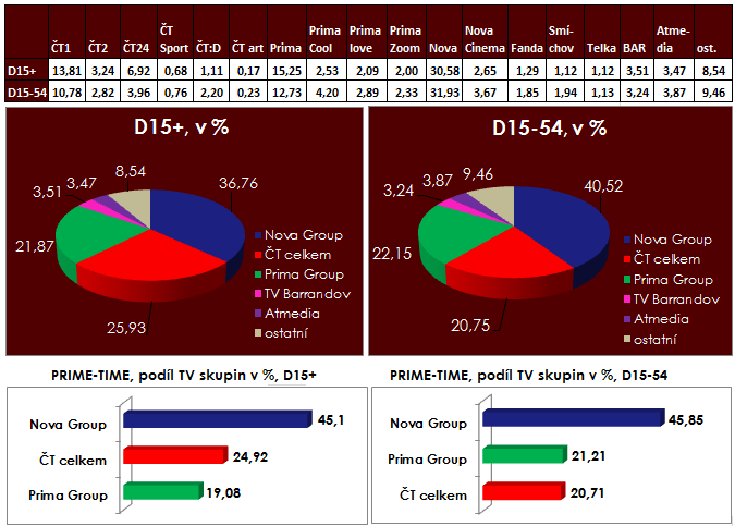 Čtvrteční večerní sledovanost nepřinesla zásadní překvapení, nejsledovanějším pořadem byl jasně seriál Ordinace v růžové zahradě (Nova), který zhlédlo v průměru 1,8 mil. diváků nad 15 let. Dvojkou večera byl další seriál – Kriminálka Miami (TV Nova). Díky tomu ovládla Nova Group hlavní vysílací čas v obou sledovaných cílových skupinách.