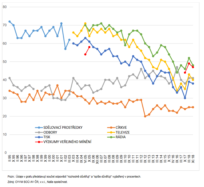 Postupný pokles důvěry v média začal přibližně v roce 2011, v březnu 2014 se zastavil, kdy došlo k nárůstu o 5 procentních bodů, následně však pokles znovu pokračoval. Letos v březnu opět důvěra významně vzrostla – v případě tisku o 9 pb., televize o 8 pb. a rádia o 5 pb.
