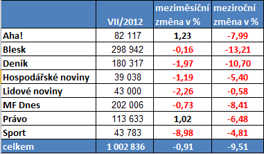 Deníky Aha! a Právo zaznamenaly jako jediné v letošním červenci ve srovnání s předcházejícím měsícem červnem mírné vylepšení úrovně prodaných nákladů – v obou případech se jejich prodej zvýšil o jedno procento.