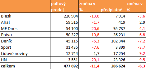 Nejlépe si v meziročním i meziměsíčním srovnání vedly Lidové noviny, které celkový prodaný náklad navýšily. K navýšení, které dosud táhly především tzv. elektronické verze, mírně pomohlo i zvýšení pultového prodeje (tedy prodeje v trafikách, supermarketech, benzínových pumpách atp.). Pultový prodej přitom českým deníkům klesá rychleji než předplatné a meziroční vylepšení bilance v pultovém prodeji je ojedinělé.