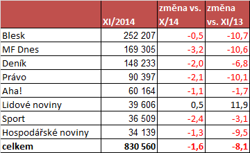Celkový průměrný prodaný náklad tuzemských deníků dosáhl v listopadu 2014 podle dat Kanceláře ověřování nákladů tisku ABC ČR 831 tis. výtisků, což bylo o 8 % méně než ve stejném měsíci roku 2013. V průměru to znamená meziročně nižší počet prodaných výtisků novin o 73 tisíc denně. Celkový trend vývoje prodaných nákladů českých deníků se tak příliš nemění. Ve srovnání s předchozím měsícem říjnem se prodalo o 1,6 % výtisků méně.