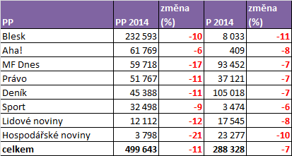 Průměrný prodaný náklad tuzemských deníků se oproti roku 2013 snížil