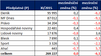 V pultovém prodeji si ve srovnání s listopadem mírně polepšily Hospodářské noviny, Blesk a Právo. Meziročně ale žádný z deníků svůj pultový prodej nezvýšil. V předplatném si meziročně polepšily pouze Lidové noviny.