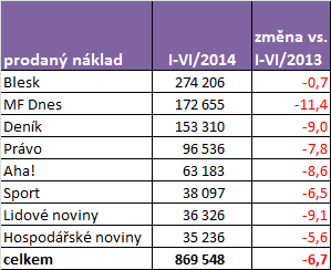 Průměrný prodaný náklad českých deníků za období prvního pololetí letošního roku představuje 870 tisíc výtisků denně. To je o necelých 7 % méně než v prvním pololetí 2013. Znamená to, že každý den se v průměru v letošním pololetí prodalo o 60 tisíc výtisků méně než v loňském pololetí.