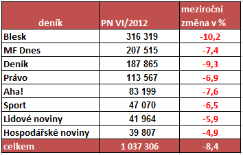 Auditované výsledky o prodaných nákladech deníků za první pololetí napovídají, že v průměru se letos od ledna do června každý den prodalo 1,037 mil. výtisků deníků. Oproti stejnému období vloni to bylo o necelých 100 tisíc výtisků deníků méně (-95 tis.). Představuje to meziroční pokles o více než 8 %. Trend vývoje prodaného nákladu z posledních let se tak nemění, když se prodané náklady deníků meziročně snižují v rozmezí 8-10 %.