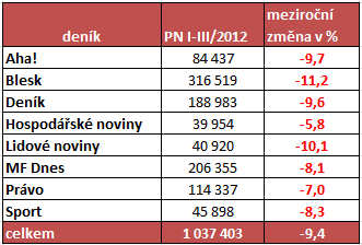 českých deníků v prvním letošním čtvrtletí ve srovnání se stejným