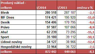 Prodané náklady tuzemských deníků se i v prvním letošním měsíci vyvíjely podobně jako v předcházejících letech. První měsíc letošního roku se v průměru každý den celkově prodalo 872 tis. výtisků, což bylo ve srovnání se stejným obdobím loni o 8 % méně. To znamená, že každý den se v letošním lednu v průměru prodalo o 77 tisíc výtisků méně než v loňském lednu.