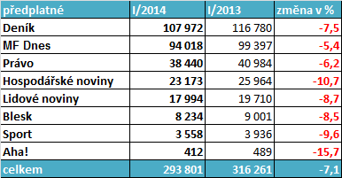 Pokles předplatitelů je méně pozvolný než v případě pultového prodeje. Největší počet předplatitelů vykazují regionální deníky Deník. Nepočítáme-li bulvární Aha!, jehož počet předplatitelů je spíše symbolický, nejvíce se počet předplatitelů v meziročním srovnání snížil Hospodářským novinám. Desetiprocentní pokles znamená meziroční snížení o necelých 3 tis. předplatitelů.