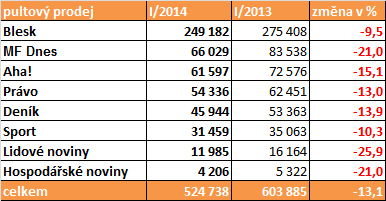Nejpříznivěji se letos v lednu v meziročním srovnání vyvíjely prodané náklady bulvárního deníku Blesk, který za loňským lednovým výsledkem zaostal pouze o 2 %.