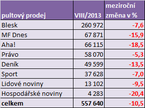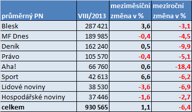 Ve srovnání s letošním červencem se v srpnu dařilo nejlépe deníku Sport a bulvárnímu Blesku, kterému se po nástupu nového šéfredaktora Radka Laina daří snižovat loňskou ztrátu. V meziročním srovnání se pokles Blesku v srpnu dostal na úroveň jen 3 %, což je nejlepší výsledek společně s Hospodářskými novinami. Naopak meziroční ztráta Aha! stále zůstává na úrovni 18 %.