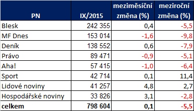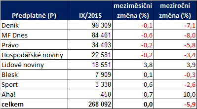 Zářijové výsledky o vývoji prodaného nákladu českých deníků přinesly příznivější obraz o jejich současném postavení. Souhrnný průměrný prodaný náklad dosáhl v září necelých 799 tis. kusů, což byl srovnatelný výsledek s měsícem srpnem. Ve srovnání se stejným obdobím loni byl sice výsledek opět nižší než před rokem, úroveň snížení byla ale necelých 6 %. To je vylepšení výsledku oproti dosavadnímu 8% poklesu.
